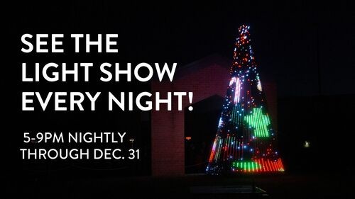 See the spectacular holiday light show on our 20 foot LED Christmas tree any night of the week! Grab a friend and a hot drink and head to the First Christian Church parking lot. Tune to 92.1 FM and sit back as the dazzling display creates holiday memories and family traditions for years to come! This unique show runs nightly from 5-9PM (6-9PM on Christmas Eve).