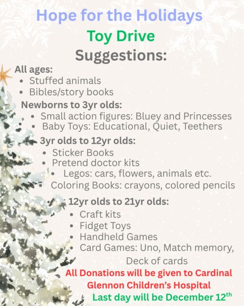 This year, we will be collecting donations for Hope for the Holidays Toy Drive! This drive was created by Grace Greenhoff as a way to pay it forward to Cardinal Glennon Children’s Hospital, where she received care for many years for her kidney transplant. Feel free to bring a new, unwrapped toy (suggestions above) with you to the Tree Lighting or to the church office any time to be collected by December 12.